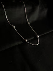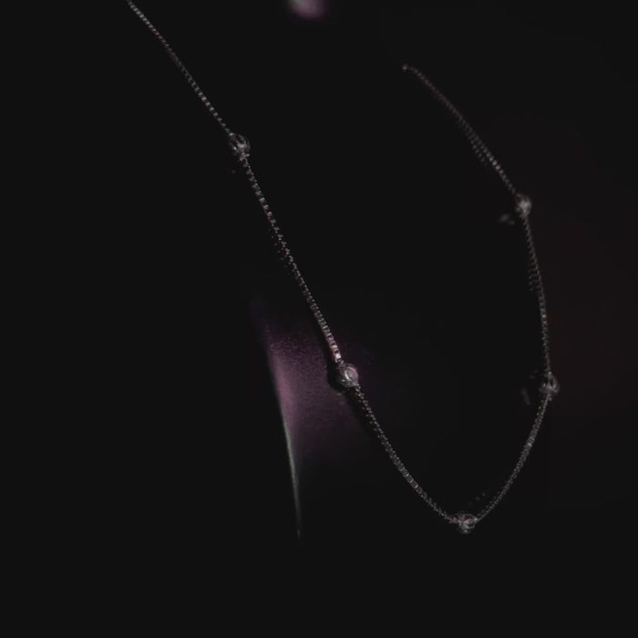 Crafted in silver, this chain features evenly spaced, fine spherical beads along a fluid cable link. Inspired by stardust trails and moonlit dew, each bead reflects soft light with a radiant glow that dances with your every move.
